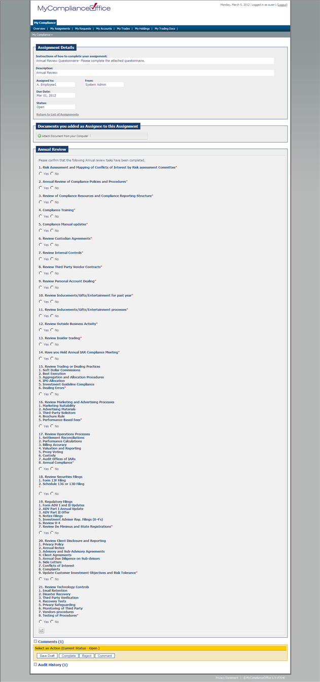 1. To answer a questionnaire contained in an assignment that has been assigned to you, select the assignment from the Assignments list. The View Assignment page is displayed, as shown below.