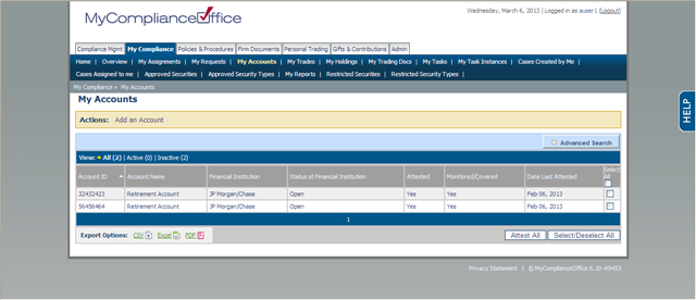 This is a listing of the users accounts. This section is usually populated during implementation as an automatic upload of all accounts. Users can also enter their own accounts here, and they can attest them if required. Accounts entered here are viewable within Admin >> Employee Accounts (by Compliance/Admin users). Accounts entered directly by users via this page remain inactive until the Compliance Admin activates them. An email can be sent from the application to notify the Compliance Admin that there is a pending active account.