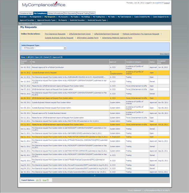 To see a list of requests you have submitted, go to MyCompliance>My Requests. You can view your list of requests here or you can filter your search by selecting one of the options on the drop down list