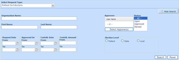 1. From MyCompliance, click on My Requests and select Political Contributions from the drop down menu.